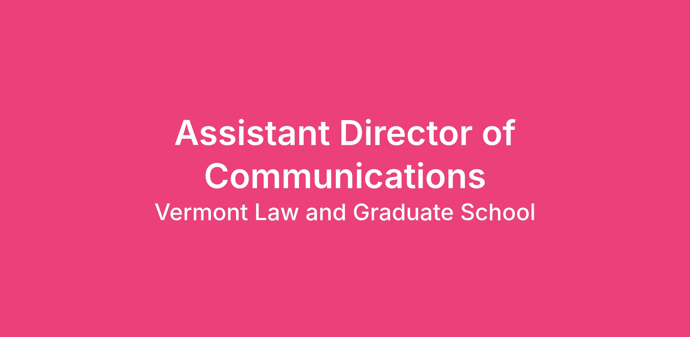 Vermont Law and Graduate School (VLGS) seeks an Assistant Director of Communications to support the institutionβs strategic communications efforts. This role manages, produces, and refines content that advances VLGSβs mission, brand, and reputation. The Assistant Director collaborates closely with campus partners to tell compelling stories and ensure consistent messaging across platforms and audiences. As a member of the Marketing and Communications team, this position contributes to editorial planning, content creation, and project management.