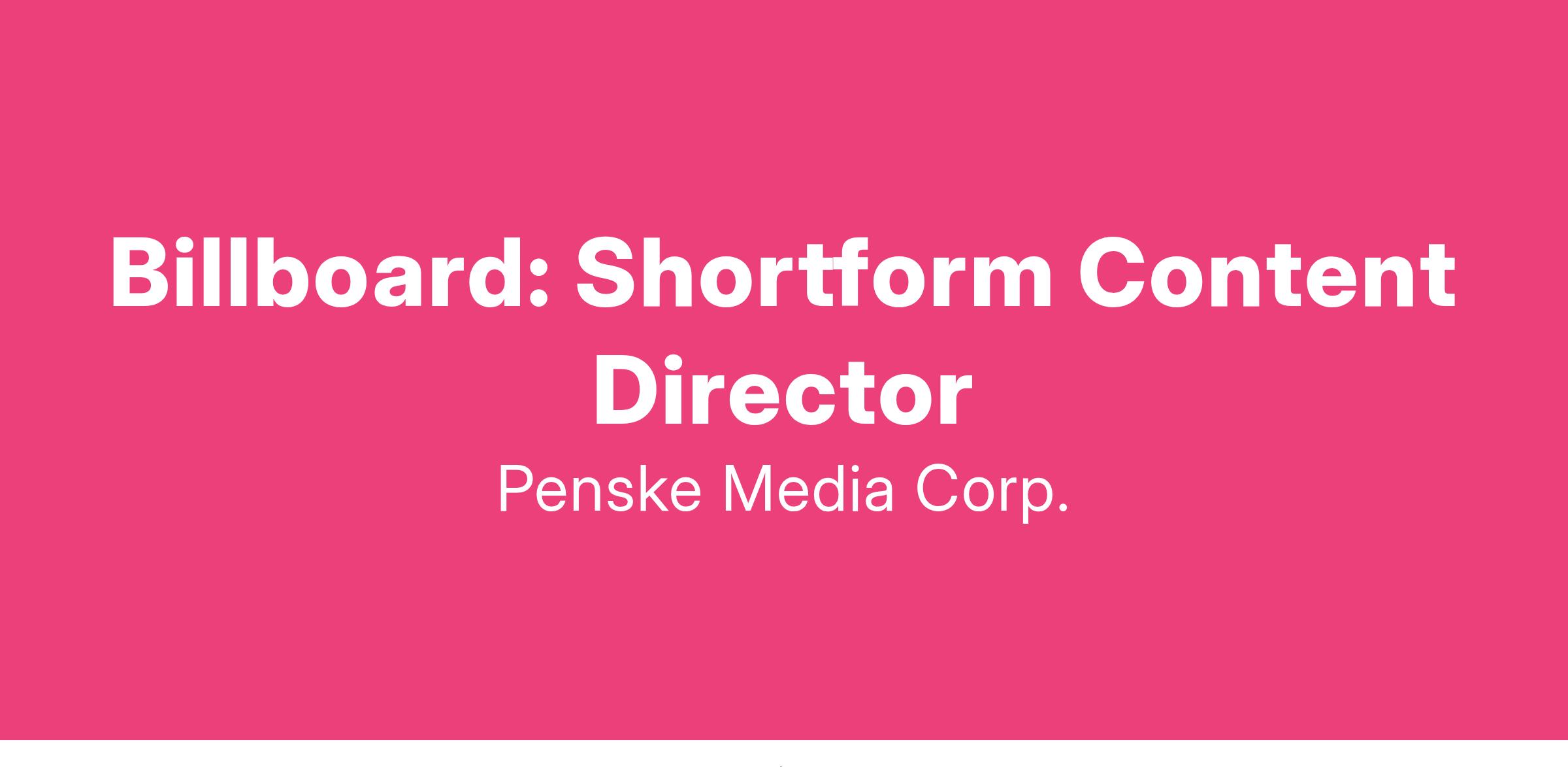 Billboard is seeking a shortform content director in New York or Los Angeles to lead its social-first content strategy across Billboard's social channels. The shortform content director will report to Billboard's chief brand officer and work in close partnership with Billboard's social director to grow and engage Billboard's social audience across platforms with social-only content, shortform video and coverage of live events, from award shows to sporting events to festivals to conferences.