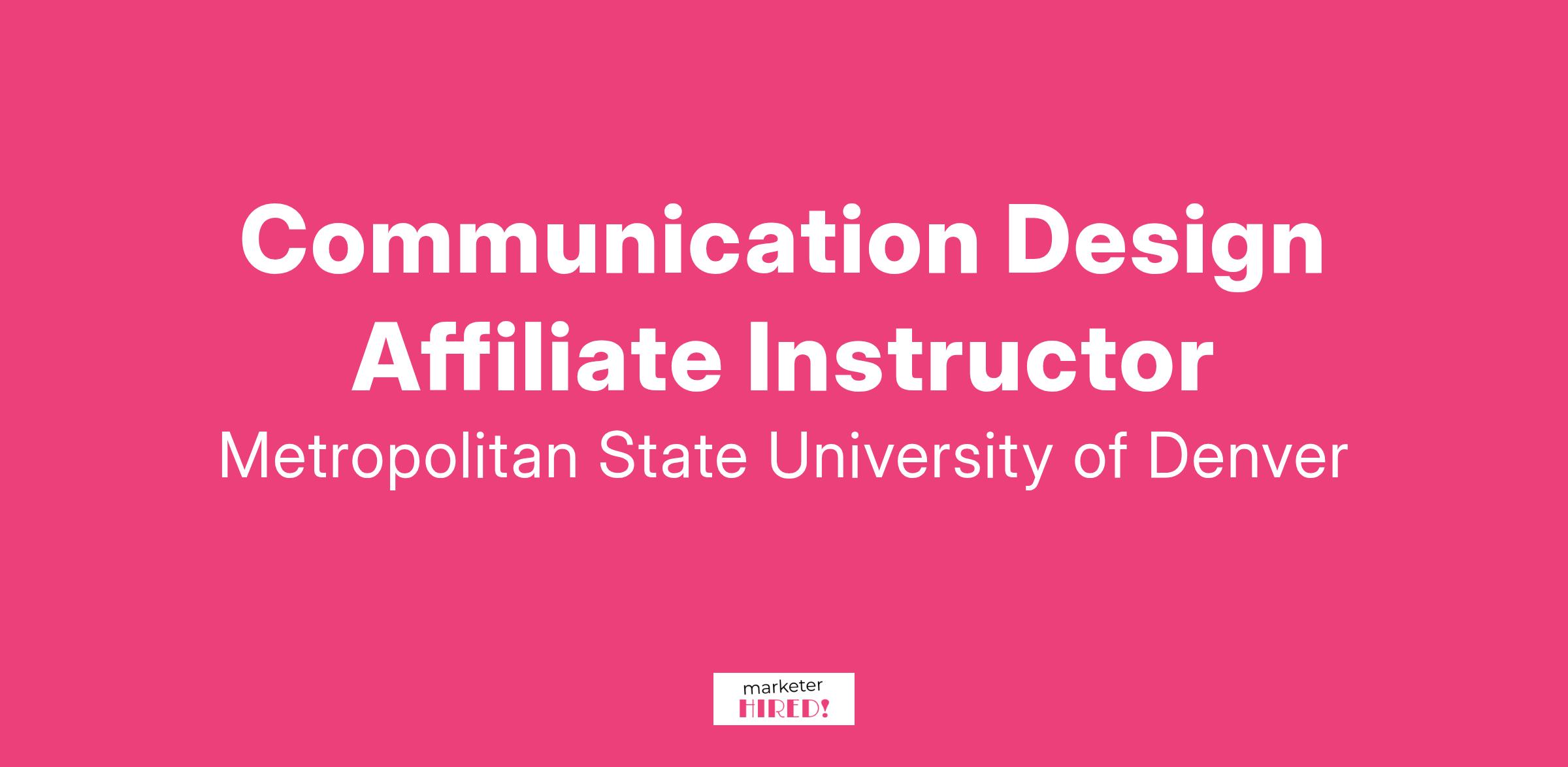 The Department of Art at Metropolitan State University of Denver (MSU Denver) invites applications for part-time affiliate faculty teaching positions in Communication Design. The Department offers programs that examine art and design in relationship to contemporary society with specific emphasis on emerging and interdisciplinary practices. Designers who are motivated by a collaborative environment emphasizing community-driven design practices are encouraged to apply. The candidate must demonstrate a commitment to teaching design practices that engage with and embrace emerging technologies.