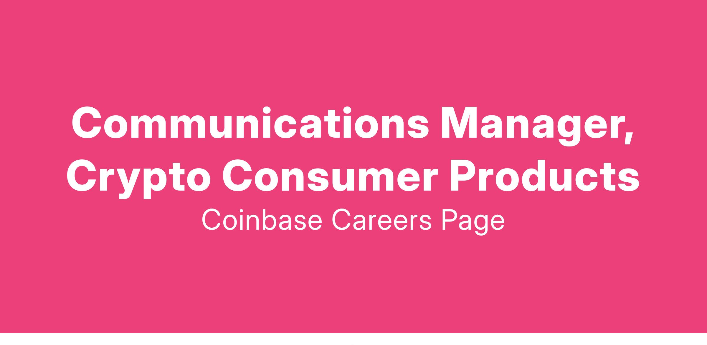 Coinbase is looking for a Communications Manager for Consumer Product Communications. This role is ideal for someone passionate about crypto, deeply knowledgeable about communications strategy for consumer crypto products, and to take an unconventional approach to comms.