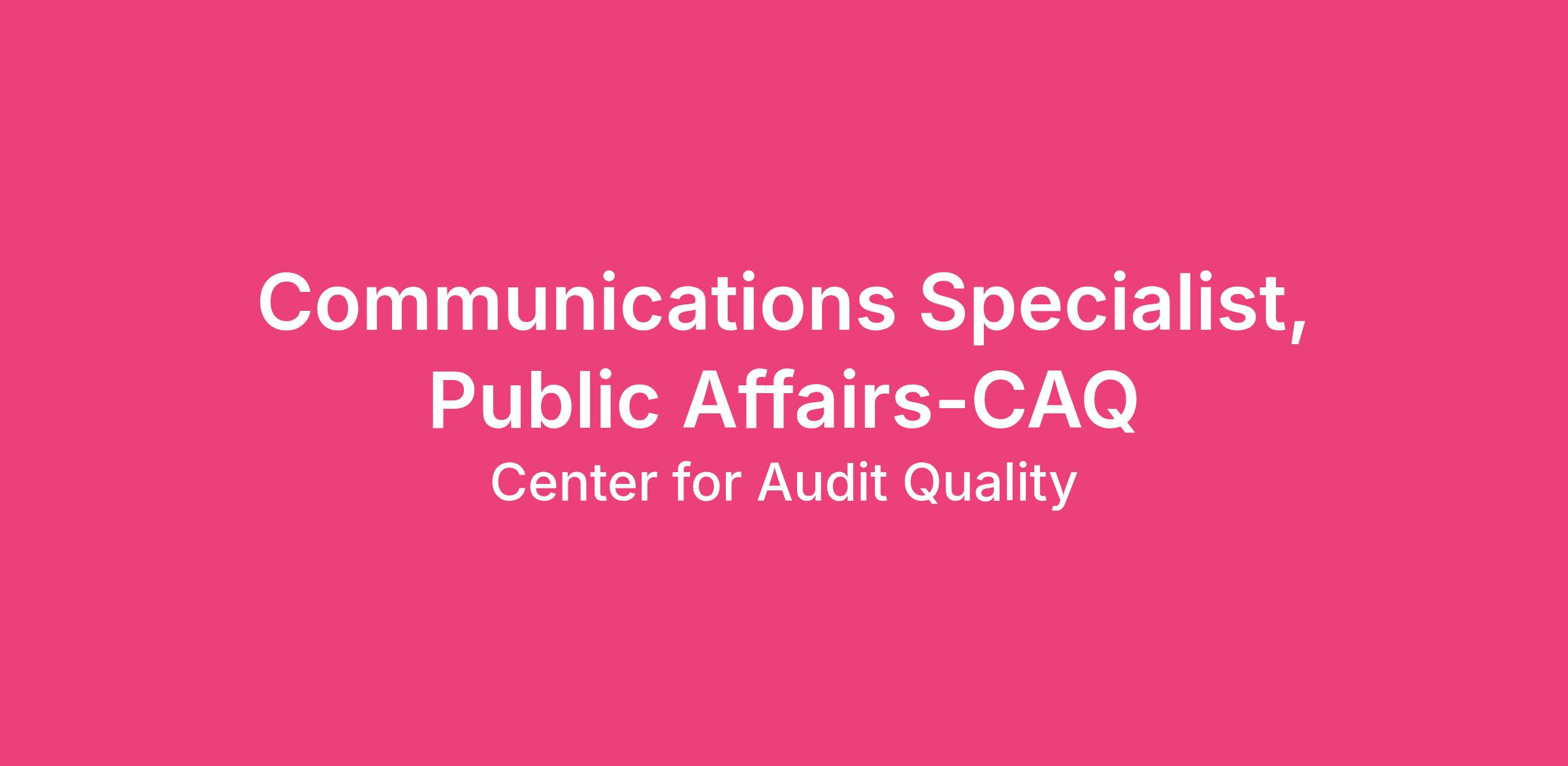 The Communications Specialist supports the Center for Audit Quality’s Public Affairs team by executing day-to-day communications operations and providing essential administrative support that keeps the team organized, responsive, and effective.