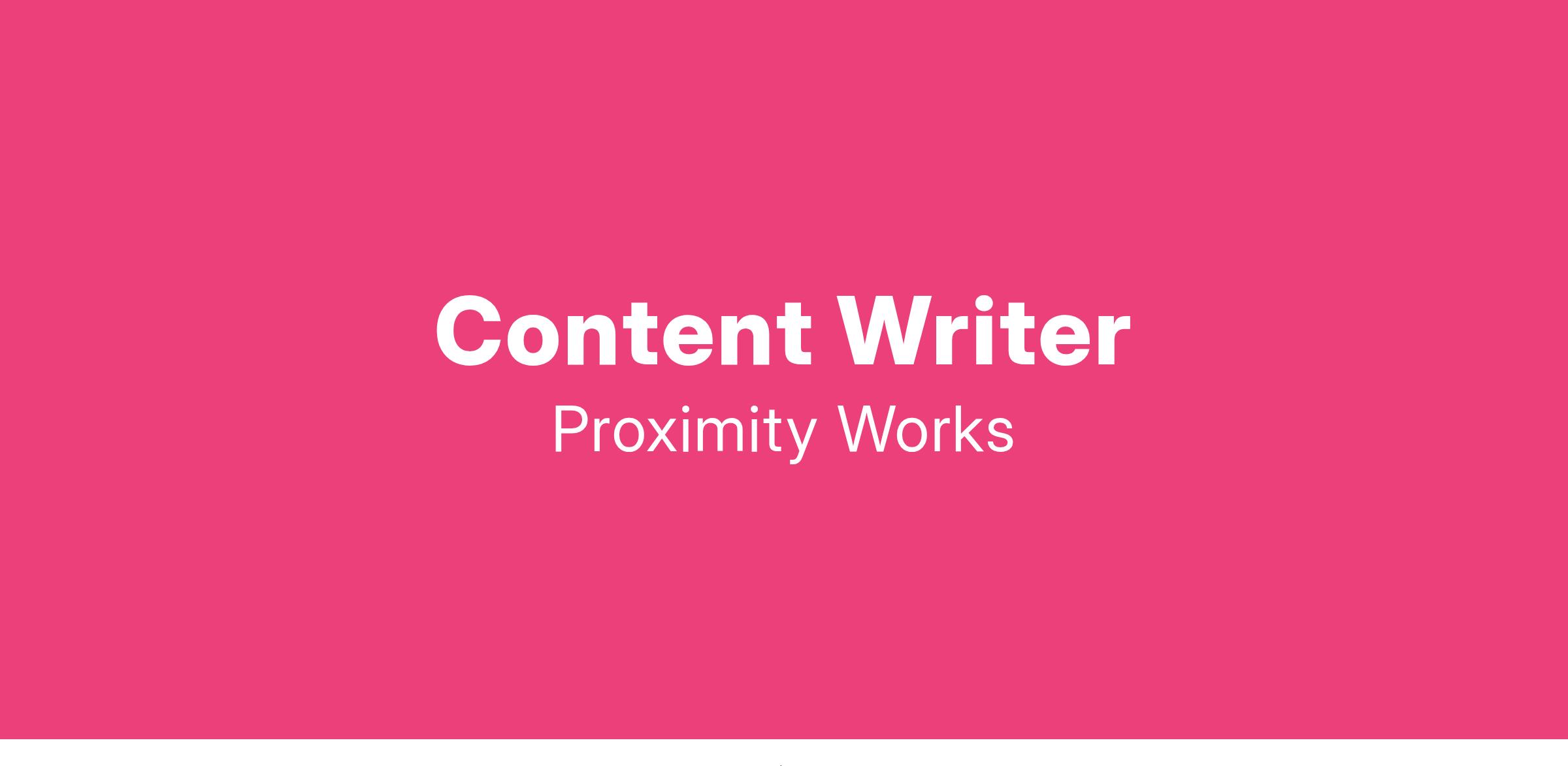 We are looking for a Content Writer to help drive all communication for our brand — both in-house and external. This includes everything from Social Media to internal policy documents, blogs, marketing content, case studies, and more. Proximity is a brand with a clearly defined tone of voice, and we value the power of good content. As the first full-time hire on our content team, you will work closely with the People Ops, Social Media, Design, and Technology teams to ensure that every piece of communication we put out is on-brand and high-quality.