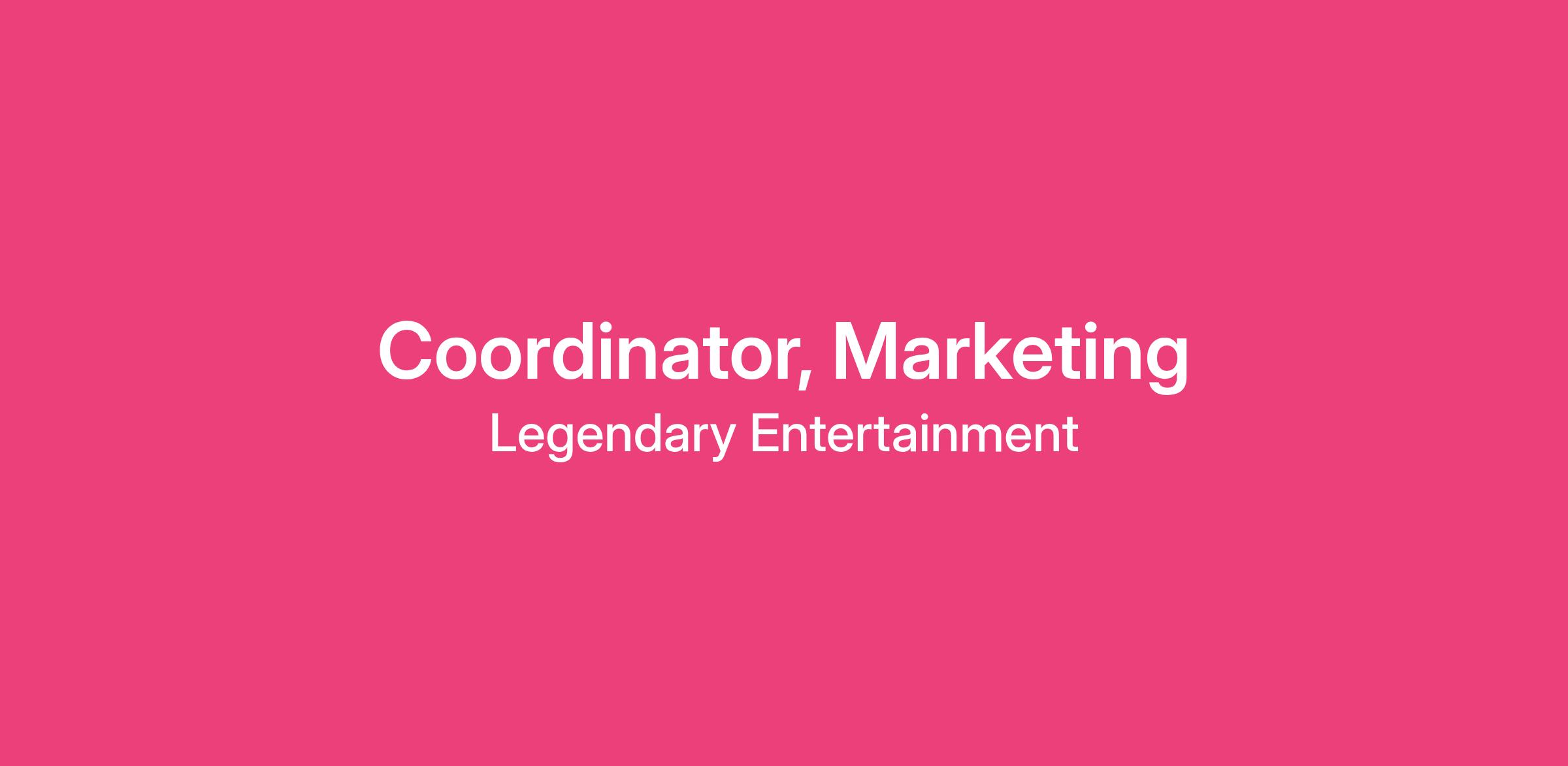 Legendary Entertainment is looking for a Marketing Coordinator to join our fast-moving, highly collaborative Marketing team, supporting major campaigns and franchises including Dune, Street Fighter, and Godzilla x Kong. This high-visibility, high-volume role combines administrative and coordination support with hands-on involvement in brainstorms, project planning, and campaign execution. The coordinator will provide administrative support to the SVP, Marketing & Digital Strategy (calendar management, phones, travel coordination, research), support the broader marketing and digital teams, and work cross-functionally with internal partners including digital, creative, publicity, and franchise, as well as external agencies and studio partners. This role is ideal for a proactive, reliable self-starter with strong organizational and communication skills, a passion for entertainment and marketing, and a digital-first mindset.