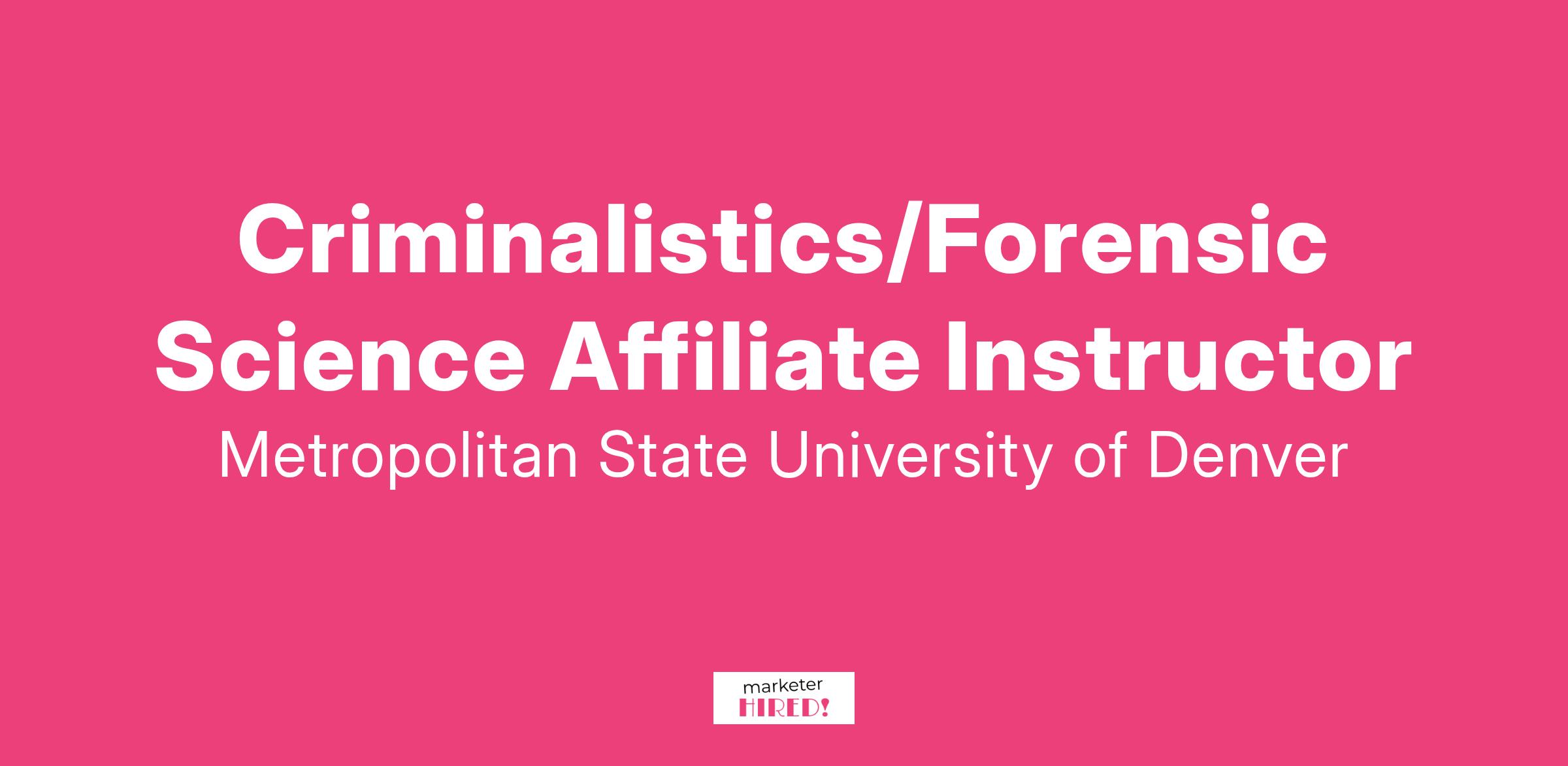 The Department of Chemistry & Biochemistry at Metropolitan State University of Denver (MSU Denver) invites applications for part-time affiliate faculty teaching positions. The primary responsibility of this position is to teach one or more of the following courses: Introduction to Criminalistics, Crime Scene Investigation I & II, Arson & Explosives, Field Testing, and Identification of Drugs.