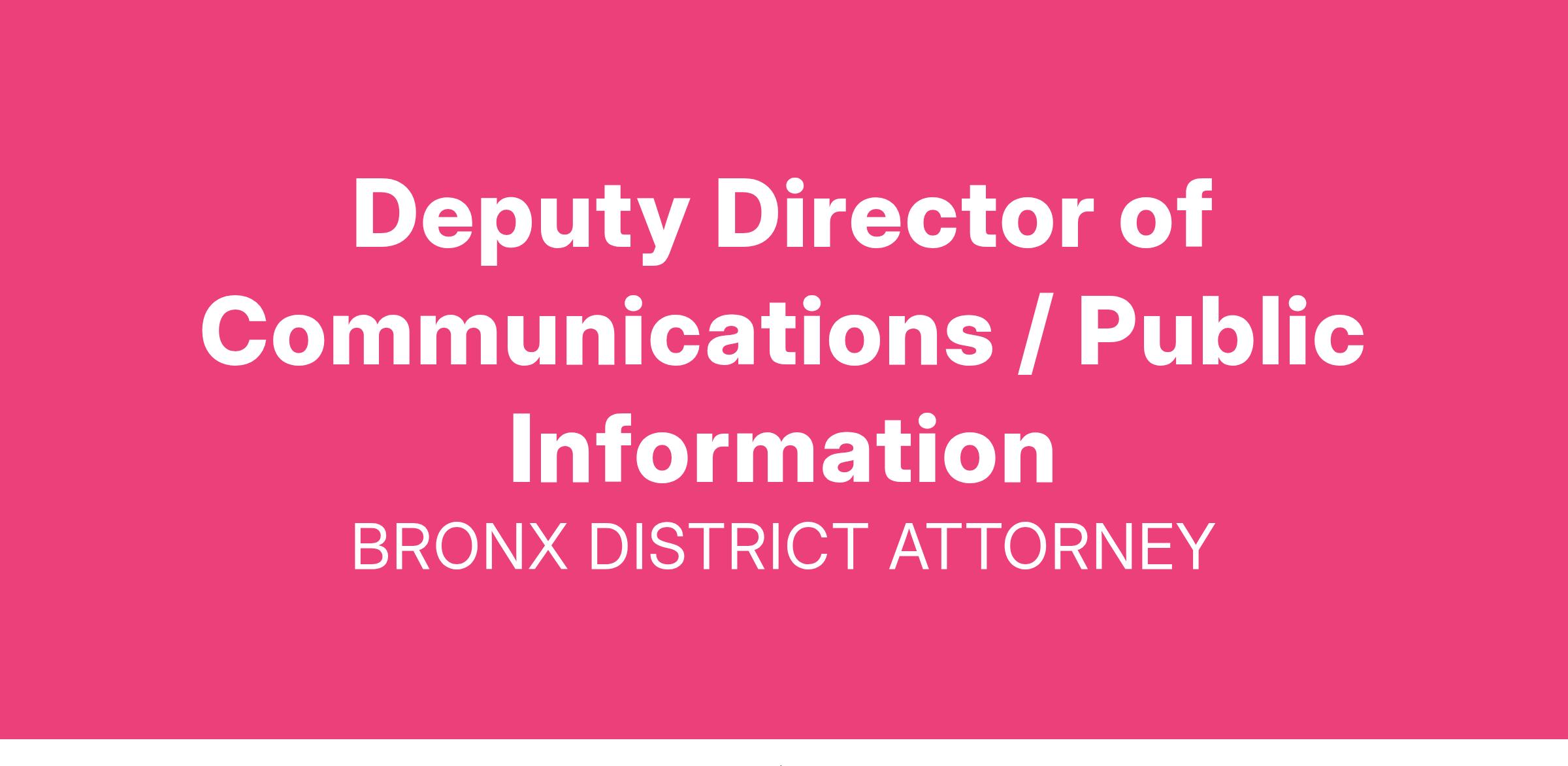 The Bronx District Attorney’s Office is seeking a well-qualified staff whose diverse backgrounds reflect an ability to serve the over 1.4 million members of the Bronx County community and pursue a safer Bronx through fair justice. The Communications/Public Information Office is looking for a Deputy Director, who should have strong knowledge of New York City, the Bronx, the Criminal Justice System, police issues and crime as well as past experience as a journalist covering these subjects. The Deputy Director will use their knowledge and experience to assist the Communications Director in handling media requests and disseminating news of the Bronx District Attorney’s Office to the media and the public as well as handling internal communications for the Office.