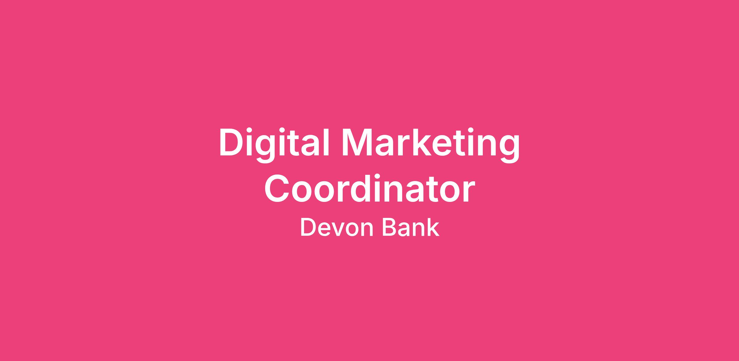 As a valued member of the Devon Bank team, the Digital Marketing Coordinator will support marketing and communication initiatives that strengthen the Bank’s brand, community presence, and relationships with colleagues and customers. This hands-on role is ideal for a creative, organized, and digitally savvy individual who enjoys working directly within digital platforms.