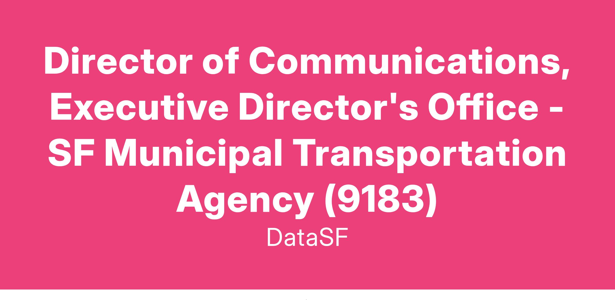 The Director of Communications will serve as the chief communications strategist for the SFMTA, overseeing executive communication, internal communications, strategic communications, government affairs, media and public relations, community engagement and outreach, marketing, and other duties as assigned. This role ensures transparent, proactive, and consistent messaging that aligns with the agency's mission to improve transportation access and safety for all San Franciscans. Reporting directly to the Director of Transportation, the Director of Communications is a core member of the agency’s executive team and manages a dynamic team to build public trust and foster collaboration.