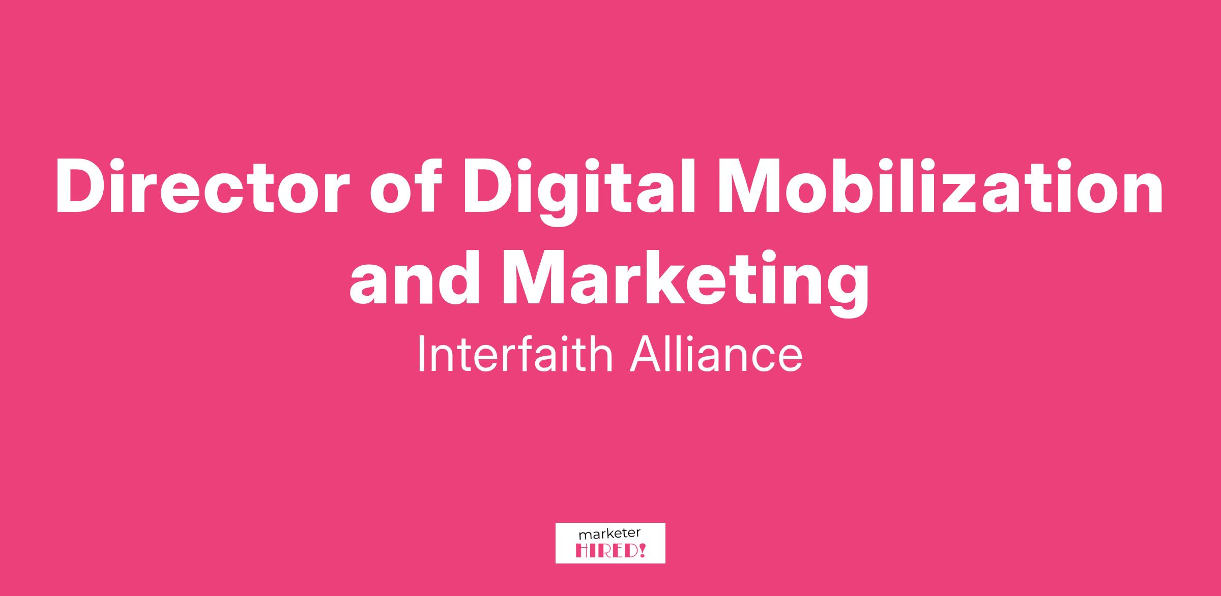 Interfaith Alliance is a network of people of diverse faiths and beliefs working together to build a resilient, inclusive democracy and fulfill Americaβs promise of religious freedom and civil rights not just for some, but for all. The candidate in this new position will join an energetic, committed, and growing team working in D.C. and across the country to βachieve democracy together.β To share our message, we employ all of the communications tools available, including social media, targeted email, action alerts, print collateral, and content production. We build integrated campaigns with messages designed to break through noise, educate and frame issues, and offer people language that gives hope and inspires mobilization and collective action. A director level role at Interfaith Alliance entails a range of responsibilities from strategy and thought leadership to execution of day to day tasks.The Director of Digital Mobilization and Marketing is set to start on March 1, 2025, and is based in Washington, DC. Applications are due by February 15, 2025 and will be considered on a rolling basis.Responsibilities: