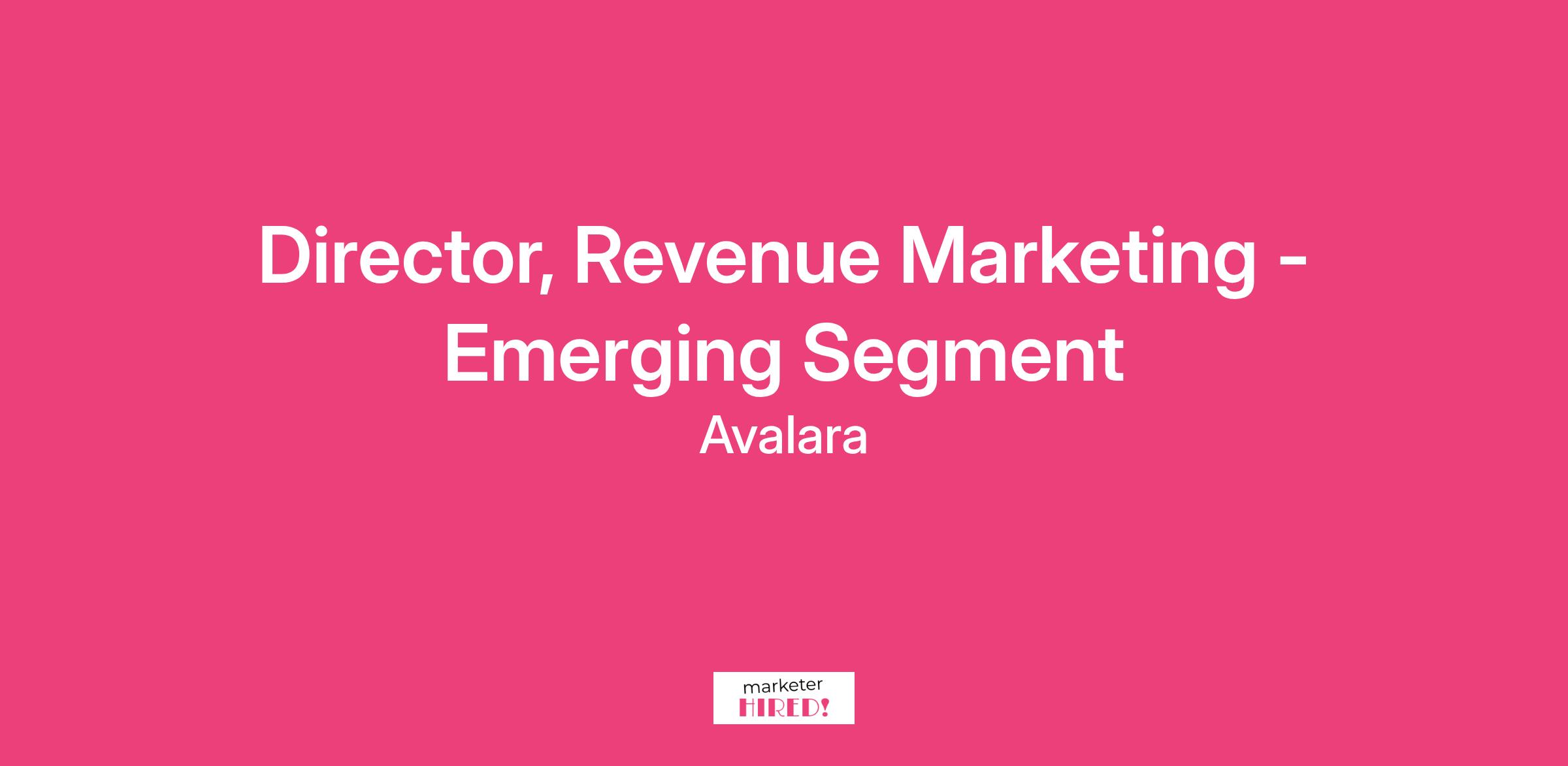 Avalara is looking for Director, Revenue Marketing focused on emerging segments to join our Revenue Marketing team, the engine behind pipeline generation, customer engagement, and growth. You will report to our VP, Revenue Marketing and will build full-funnel campaigns that convert interest into action — and action into pipeline — across segments, personas, and global territories. You will work with Sales, Partner, RevOps, and the broader Marketing team to promote measurable revenue outcomes.
