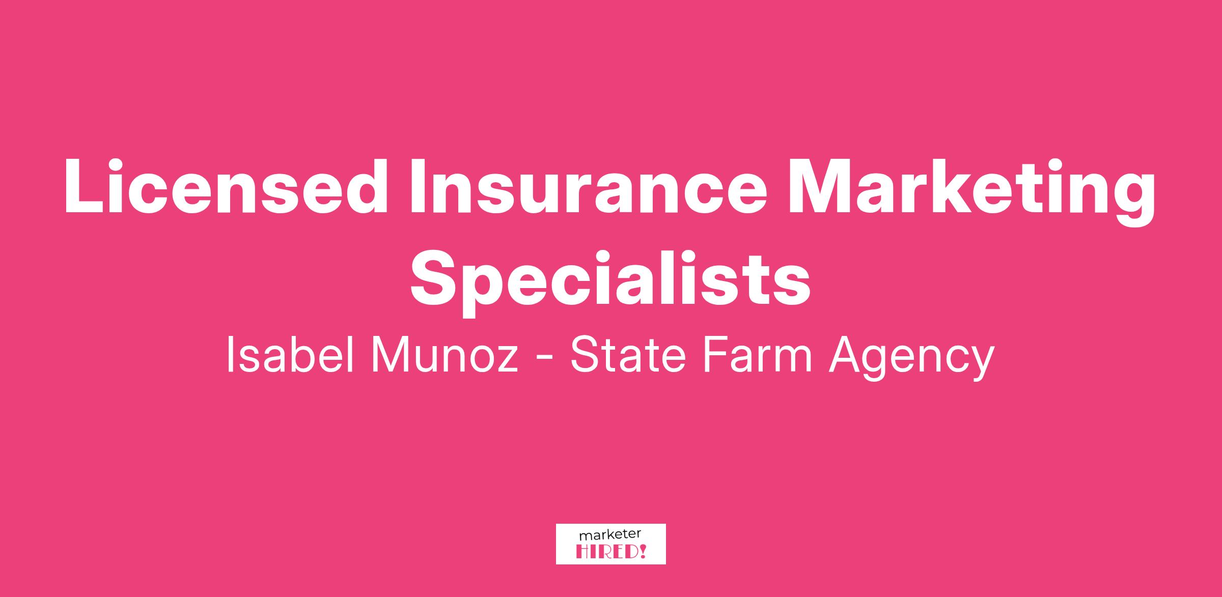 Isabel Munoz - State Farm Agency, located in Burbank, CA is expanding and we are looking for a driven insurance marketing specialist. As our marketing specialist your main role will be to call potential clients who have requested insurance quotes online (these are warm leads not cold calls) and review quote options, follow guidelines to submit the application and close the sale.