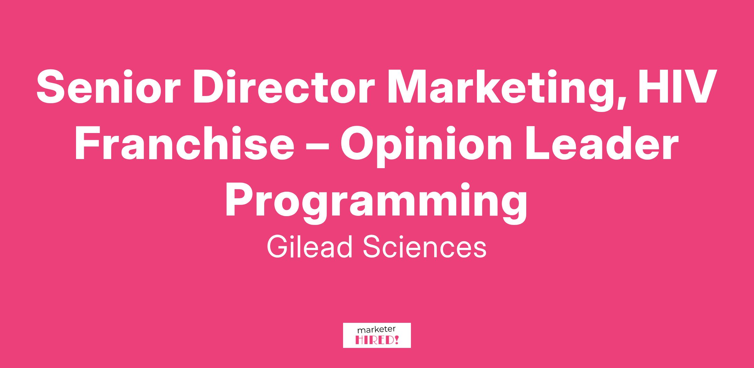 The Senior Director, HIV Franchise – Opinion Leader Programming, will report directly to the Executive Director of Franchise Marketing for the HIV business unit. In this role, you are expected to have an impact across the continuum of care supportive of both PrEP (HIV Prevention) and HIV Treatment, ultimately contributing to the $13B+ HIV BU driven by Descovy for PrEP and Biktarvy. The successful candidate will be a strategic leader who is an expert in insight generation and synthesis, driving KOL/account strategy and management for marketing while supporting the broader Gilead organization and upholding high execution standards, especially for key initiatives like speaker's bureau, advisory boards, conference debriefs and the opinion leader data base. Utilize strong leadership skills with the ability to set a vision, foster new thinking, manage change, uphold a compliance mindset, collaborate seamlessly with a diverse set of stakeholders (both internal and external), and lead and influence others. The Senior Director will be responsible for significant budget oversight and management of key agency partnerships. Additionally, they will partner closely across marketing and medical functions, various cross-functional stakeholders, and external vendors to implement OLP strategies and tactics.Essential Duties and Job Functions:Contribute to the long- and short-term US HIV treatment and prevention brand strategies and plan of actionDevelop the OLP strategic and tactical planProvide strategic oversight and management of key initiatives and activities: speaker bureau, advisory boards, conference debriefs, OL mapping/database, account management, and OL generated contentMonitor the complete HIV Landscape and identify areas of opportunity to support brand strategiesEffectively translates scientific, clinical, epidemiological, and research insights into actionable commercial ideas and activitiesEstablish and maintain relationships with key opinion leaders, key accounts, and medical associationsCollaborates with the treatment, prevention, and franchise marketing teams, medical teams, and sales leadership to ensure a coordinated and appropriate approach to maximize effectivenessLead and/or serve as a key commercial member on cross-functional initiatives, often with high visibility within the organizationProvides innovative thinking, clear communication, and is effective in change managementEvaluate and evolve current approaches and systems (as needed)Support navigating marketing materials through internal review processes to ensure projects comply with all regulatory and legal requirementsEstablish appropriate procedures, systems, metrics, and infrastructures for the OLP teamDesign and deliver presentations to a range of internal stakeholders and external audiencesCoach, develop, and manage direct reportsManage multiple marketing cost centers and associated budgetsIdentify and engage key agency partnerships to support OLP effortsEnsure compliance with all relevant laws, regulations, and policiesBackground Knowledge and Skills:A high performing marketing leader with the ability to set a vision and cultivate a high-performance culture and lead diverse teamsStrategic thinker who has a strong track record of tackling complex business problems and making recommendations while incorporating a diverse set of stakeholder input and feedbackStrong customer focus and adept at forming and maintaining a collaborative work environment with external OLs and key internal cross-functional partners (e.g., commercial, clinical development, medical affairs, regulatory, compliance, market research, etc.)Exceptionally strong interpersonal, verbal communication, and writing skills, including the ability to simplify complex topicsListens carefully to others' points of view, adapts style and content based on audience, and seeks to understand others' motivations and needsDemonstrated excellence in project management and effectively managing multiple projects/prioritiesStrong ability to measure impact and perform data analysis to drive business decisionsAbility to understand and communicate clinical data and high-level scienceDrive consensus thinking and manage conflicts among individuals from a variety of cultures and disciplinesDirect people management and experience managing highly cross-functional teams or workgroups are preferredTrack record of successful pharma/ biotech marketing in specialty categoriesDemonstrate an understanding of the pharmaceutical regulatory requirements and impact on developing marketing materialsBasic Qualifications:Bachelor's Degree and Fourteen Years' of Pharma Marketing experienceORMasters' Degree and Pharma Marketing experienceORPhD and Pharma Marketing experiencePreferred Qualifications:MBA in marketing or related fields preferredA minimum of 5 years of brand development and marketing; sales/account management experience a plusProven track record of marketing fundamentals, including advisory boards, brand plan development and execution, strategy and sales, and commercial programsExtensive knowledge and experience in pharmaceutical product life cycle management in a variety of therapeutic areas.HIV experience and relationships with HIV KOLs is preferredPrior people management experience preferredThe salary range for this position is: $261,375.00 - $338,250.00. Gilead considers a variety of factors when determining base compensation, including experience, qualifications, and geographic location. These considerations mean actual compensation will vary. This position may also be eligible for a discretionary annual bonus, discretionary stock-based long-term incentives (eligibility may vary based on role), paid time off, and a benefits package. Benefits include company-sponsored medical, dental, vision, and life insurance plans*.