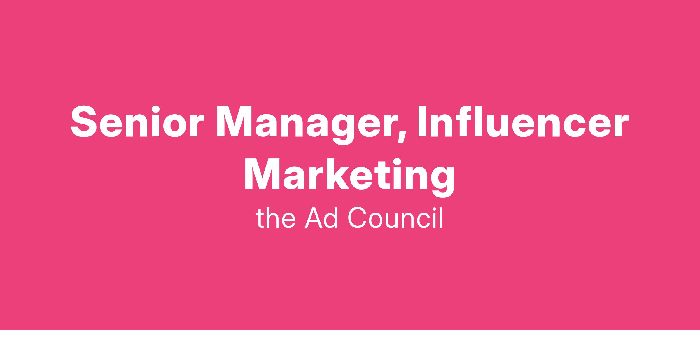 We are seeking a Senior Manager, Influencer Marketing (known at the Ad Council as Senior Manager, Creators for Good) to lead influencer strategy and execution for 4+ dedicated campaigns and support the growth of the Creators for Good brand. You will be a key member of a team that is growing rapidly and expanding their remit among the existing roster of Ad Council campaigns and will blend both day-to-day campaign execution and strategic planning.