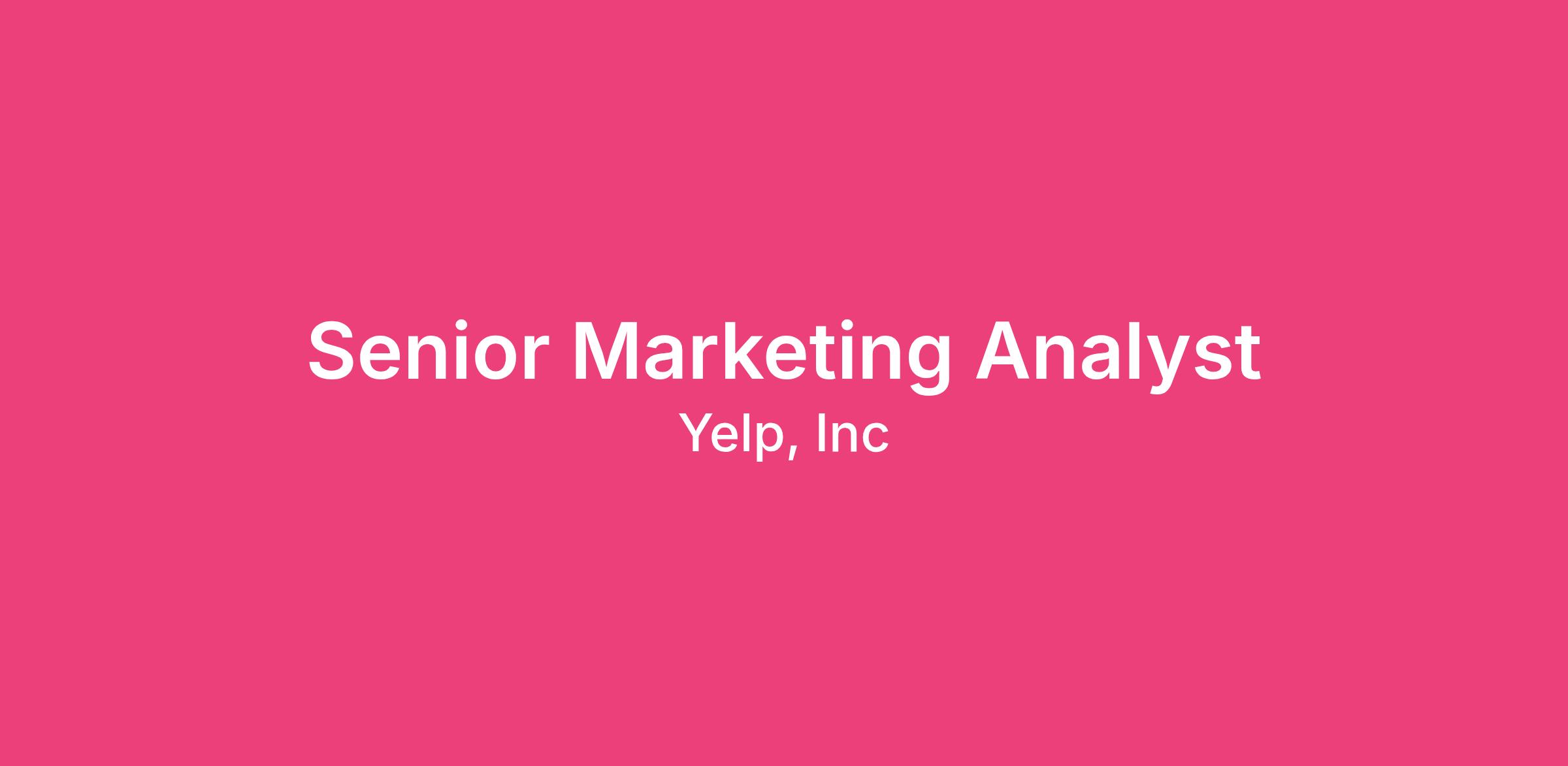 Yelp is seeking a Senior Analyst to help drive marketing efforts that support continued revenue growth. In this role, you’ll be joining the Marketing Analytics Team at Yelp, a centralized consulting team that helps drive consumer and business growth through multiple channels, including email, push, paid advertising, web marketing, and more. Your day-to-day responsibilities will range from informing broader marketing strategy to analyzing the efficacy of new campaigns. Expect to collaborate with stakeholders, including senior leaders, to provide a data-driven lens on marketing decisions. Data is at the core of everything we do, and you will play a critical role in equipping the marketing organization with the insight needed to make scalable strategic decisions.