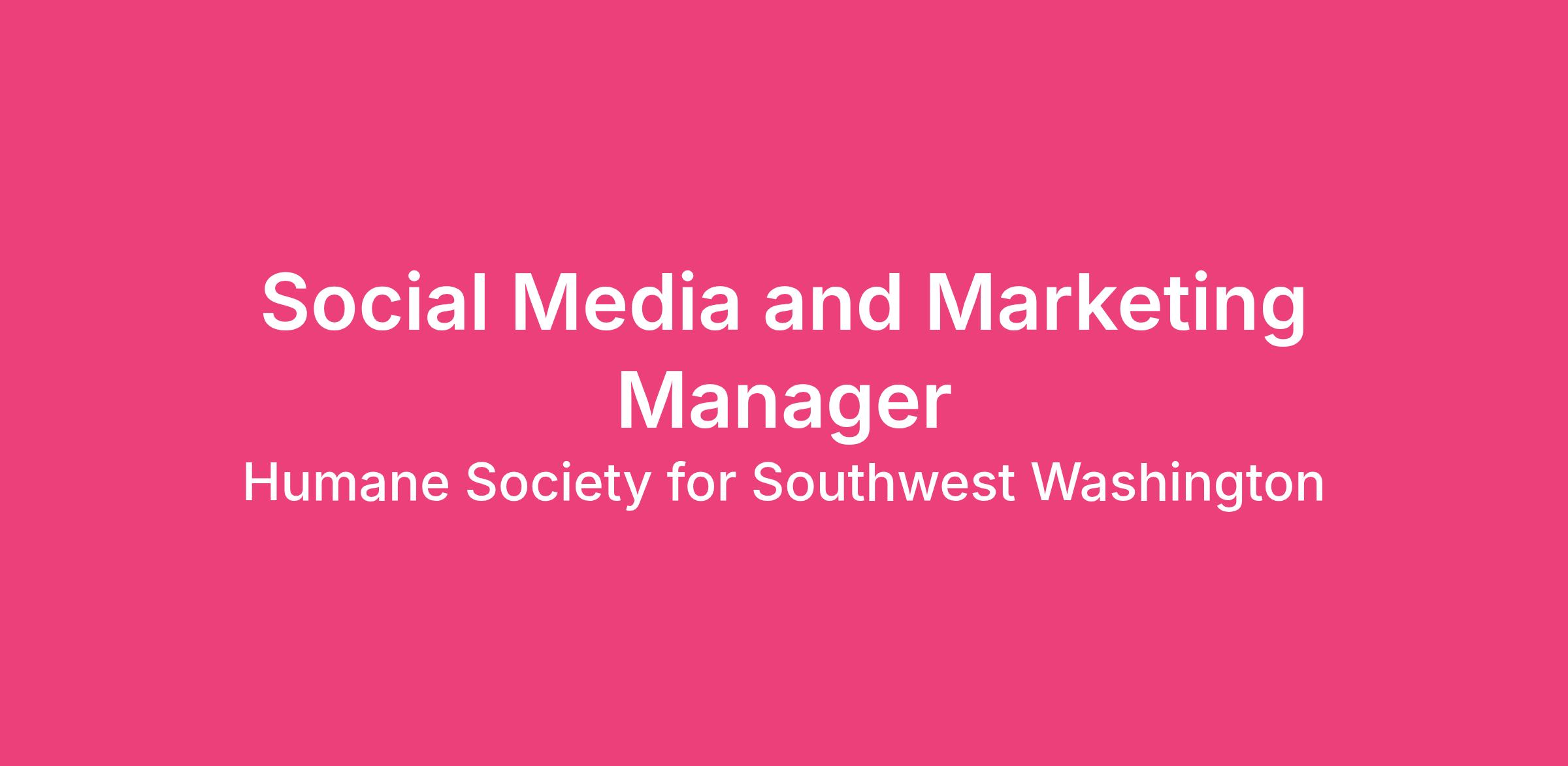 The Humane Society for Southwest Washington is currently seeking a Social Media and Marketing Manager to join our team. This is a full-time, FLSA nonexempt opportunity.