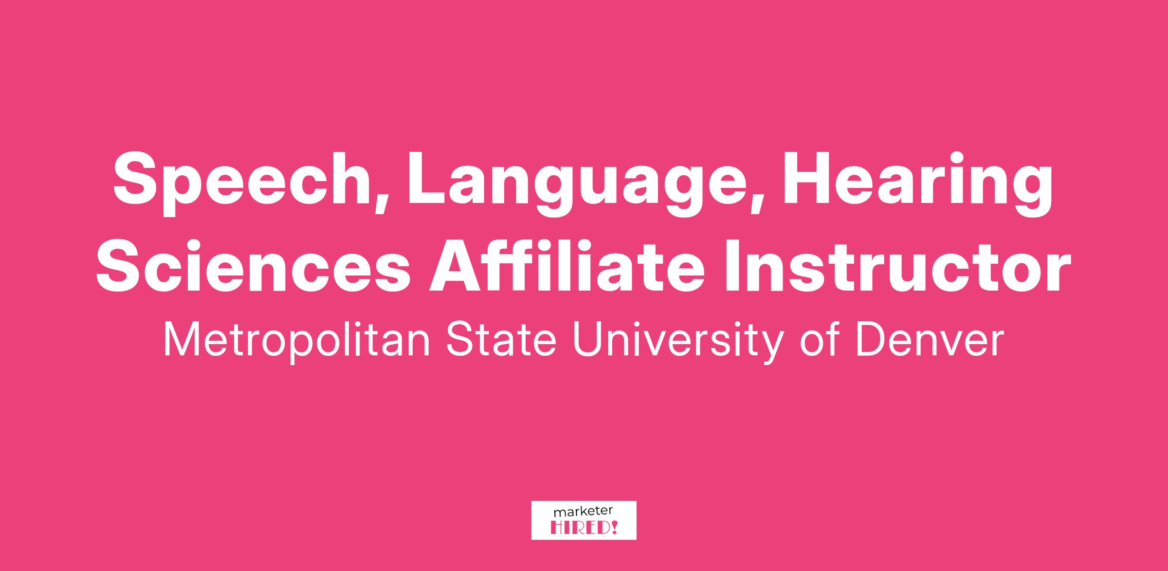 The Department of Speech, Language, Hearing Sciences at Metropolitan State University of Denver (MSU Denver) invites applications for part-time affiliate faculty teaching positions. The primary responsibility of this position is to teach one or more credit hours as determined by the department; areas of teaching include undergraduate and graduate courses.