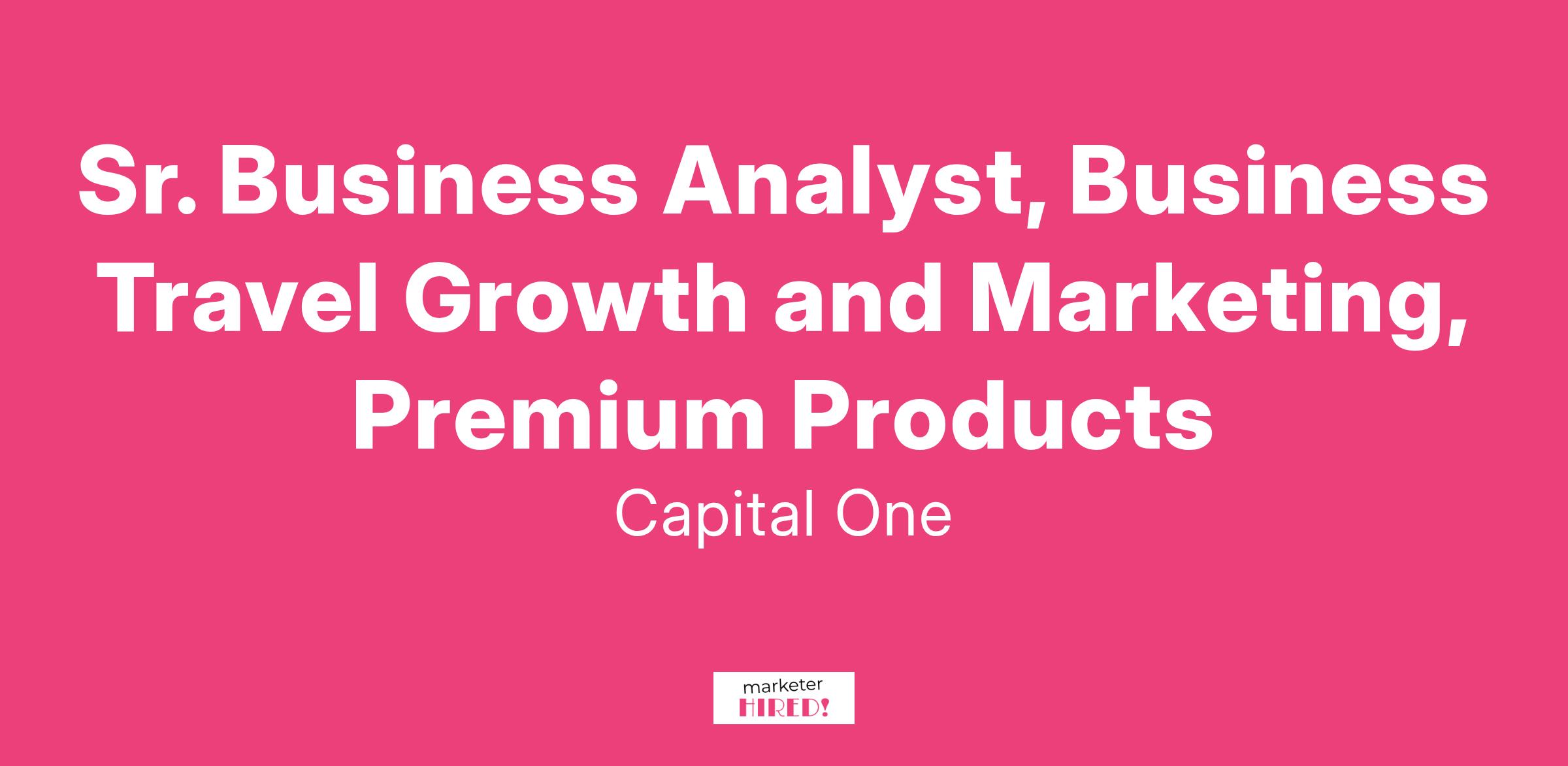 Sr. Business Analyst, Business Travel Growth and Marketing, Premium ProductsThis is your opportunity to join the fast-growing Capital One Business Travel team, as we seek to transform the way business customers book and manage travel. Our mission is to grow and develop our product into an industry leading business travel platform that delivers unique, differentiated benefits to our millions of customers while also powering the headline marketable benefits of our credit card products.This role will be focused on Capital One Business Travel's growth and marketing strategy. You will work with a cross-functional team to deeply understand our target users' needs, define a new product value proposition based on those needs, develop strong, competitive marketing claims, and establish headline benefits that will drive meaningful growth for our business. You will leverage a combination of user research, feedback, and data analysis to power these recommendations, balancing customer desirability and business growth.To be successful in the role, you will need to be a well-rounded 'business athlete' - a creative, analytical, and technically proficient problem solver who understands both the dynamics of the business and the competitive landscape. The ideal candidate is resourceful, motivated, and self-sufficient, with demonstrated success in spearheading cross-functional projects that drive the growth and success of a business.Summary: As a Senior Business Analyst at Capital One, you will apply your strategic and analytical skills to major company challenges. You will team with world-class professionals to develop and test strategies that ultimately impact the bottom line. And you will do it all in a collaborative environment that values your insight, encourages you to take on new responsibility, promotes continuous learning, and travel innovation.Key Responsibilities:Product marketing: Support marketing efforts for our travel platform, and help develop strategic intent for our travel growth initiatives. Help build targeted insights to inform the design and development of new travel experiences, and deliver on new go to market strategies