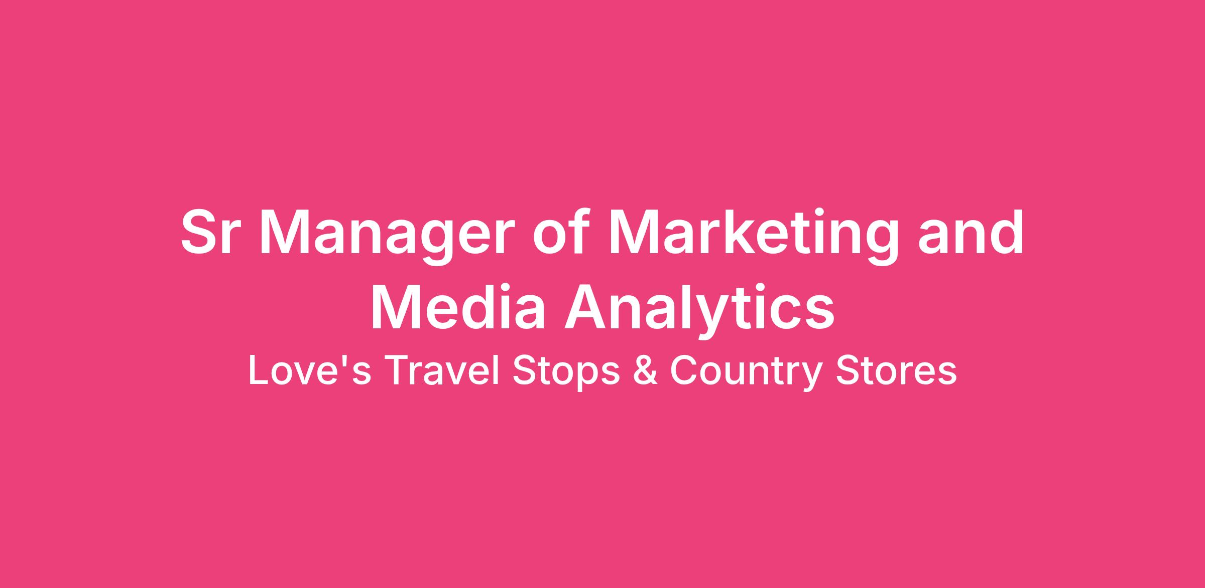 Welcome to Love's: The Sr Manager of Marketing & Media Analytics is responsible for overall marketing analytics and measurement strategy across the enterprise. This leader will build and scale the team (hiring, developing talent, establishing practices) while delivering immediate value through improved measurement, attribution, and insights.