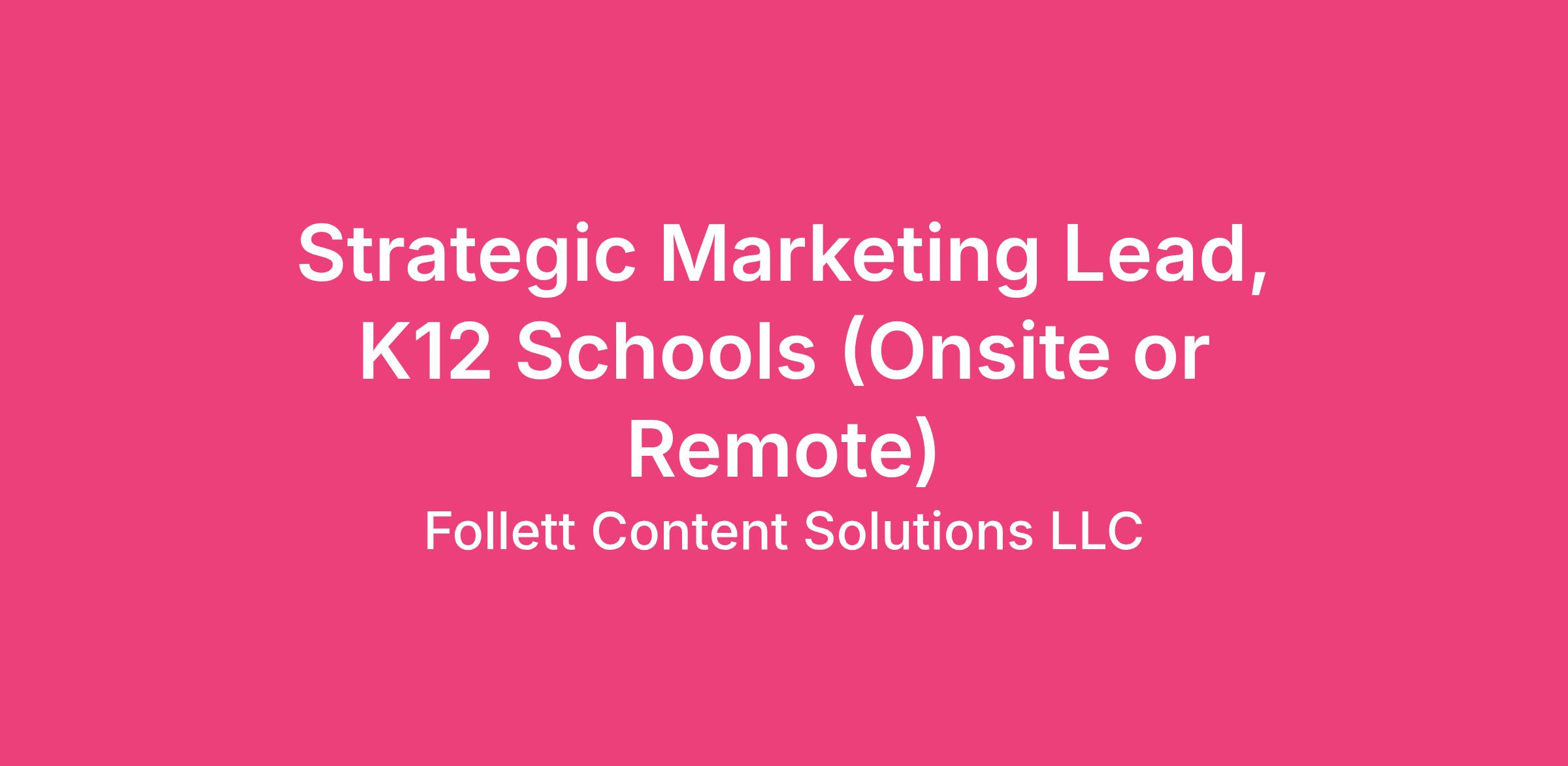 Follett Content Solutions has been a trusted partner for educators since 1873! We support our educators that touch more than 45 million students worldwide. Follett Content Solutions helps build a diverse collection of print and digital resources to support every student. We are currently hiring for a Strategic Marketing Lead, K12 Schools. This position is an exempt full-time position offering $110,00.00 - $130,000.00 annually with bonus potential. We are looking for an onsite team member working in our McHenry, IL on a hybrid schedule of Monday, Tuesday and Thursdays in the office or for the ideal candidate we will consider remote.
