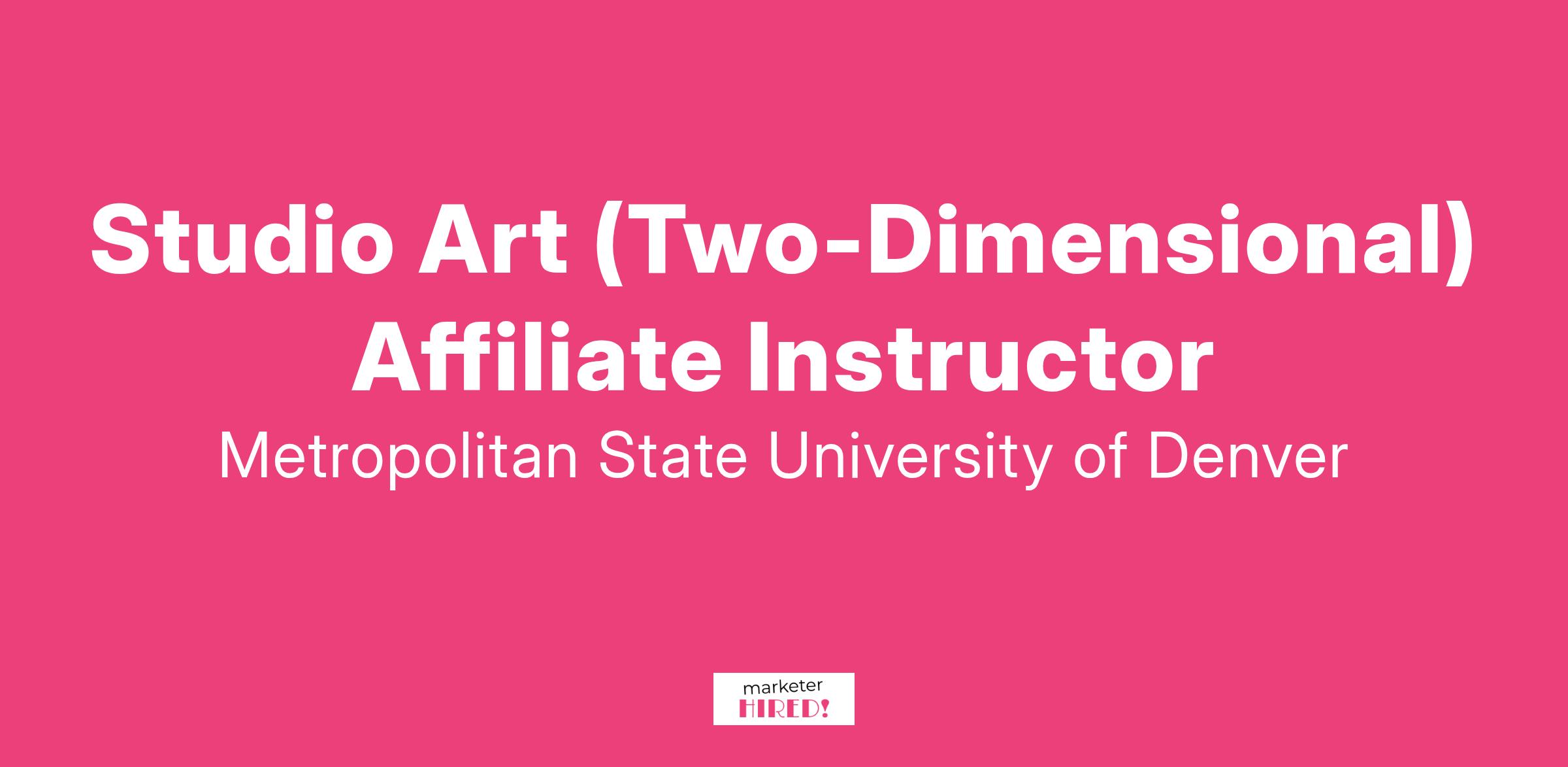 The Department of Art at Metropolitan State University of Denver (MSU Denver) invites applications for part-time affiliate faculty teaching positions in Studio Art, two-dimensional media. MSU Denver is NASAD accredited and offers study in interdisciplinary artistic practices as well as media-specific coursework. The successful candidate will be interested in teaching classes that contributes to the contemporary focus of our Studio Art program.
