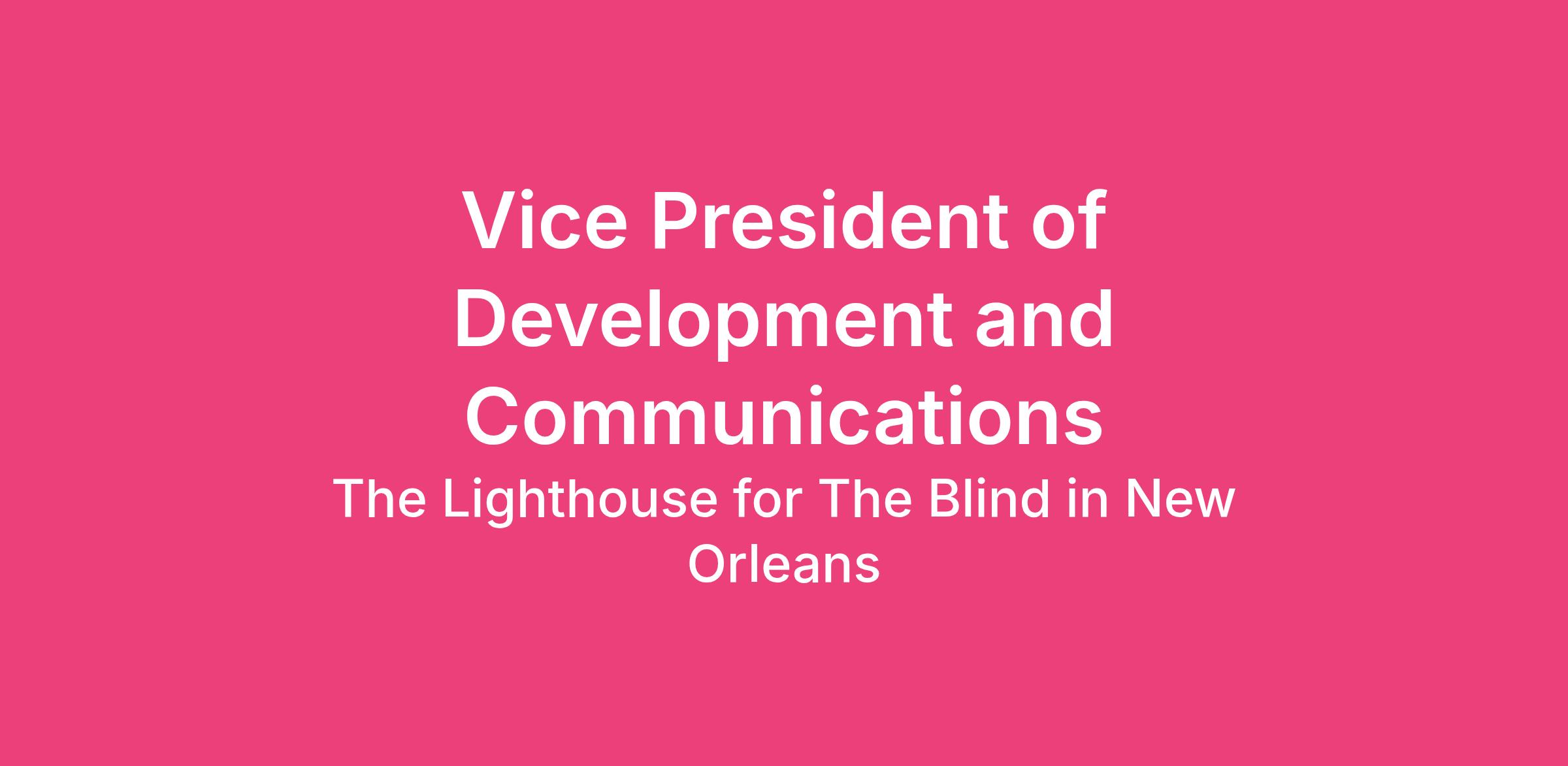 The Vice President of Development & Communications (VPDC) is an integral member of the executive management team, who ensures that Lighthouse Louisiana has a comprehensive fundraising and communications strategy to position the organization as an essential community resource and a meaningful investment for potential funders. The VPDC is an ambassador who strategically tells the Lighthouse story to key stakeholders and the media to drive awareness, while building donor support. The VPDC oversees all communications activities that enhance the organization’s brand reputation and is responsible for implementing a broad range of public relations activities related to the strategic direction and positioning of the organization to further its mission. The VPDC reports to the President & CEO and collaborates with all Lighthouse employees to ensure the internal and external integrity of the brand.